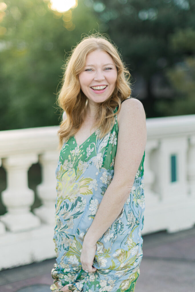 After soaking up the views at Sabine Street Bridge, we wandered down to Eleanor Tinsley Park — one of my favorite places for engagement photos in Houston. The grass still had that pretty morning dew, and we found the most gorgeous tree casting this soft, dreamy shade.